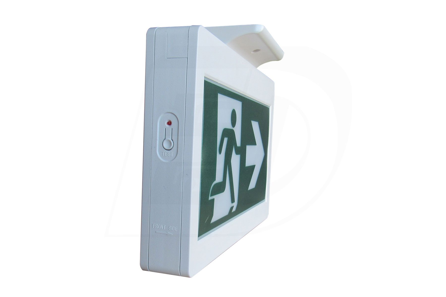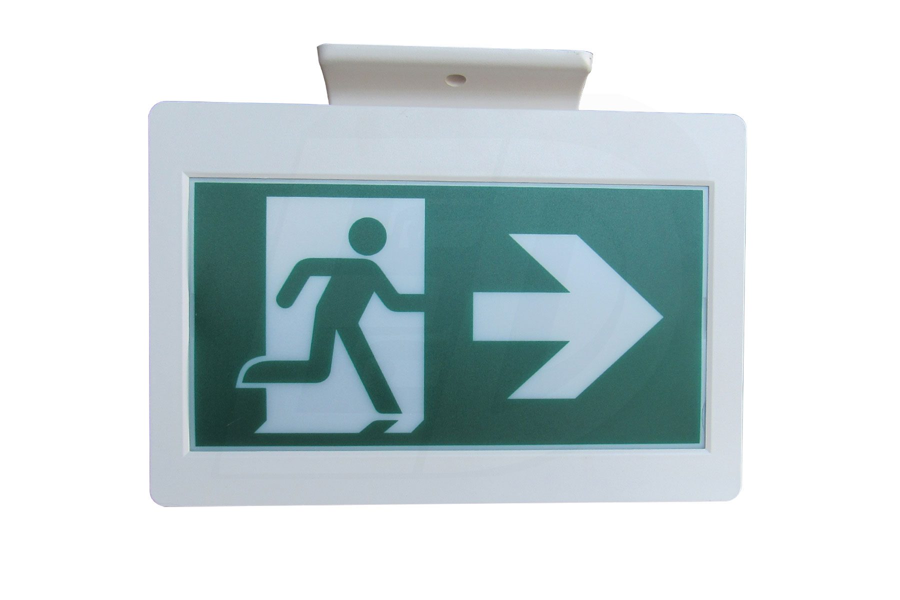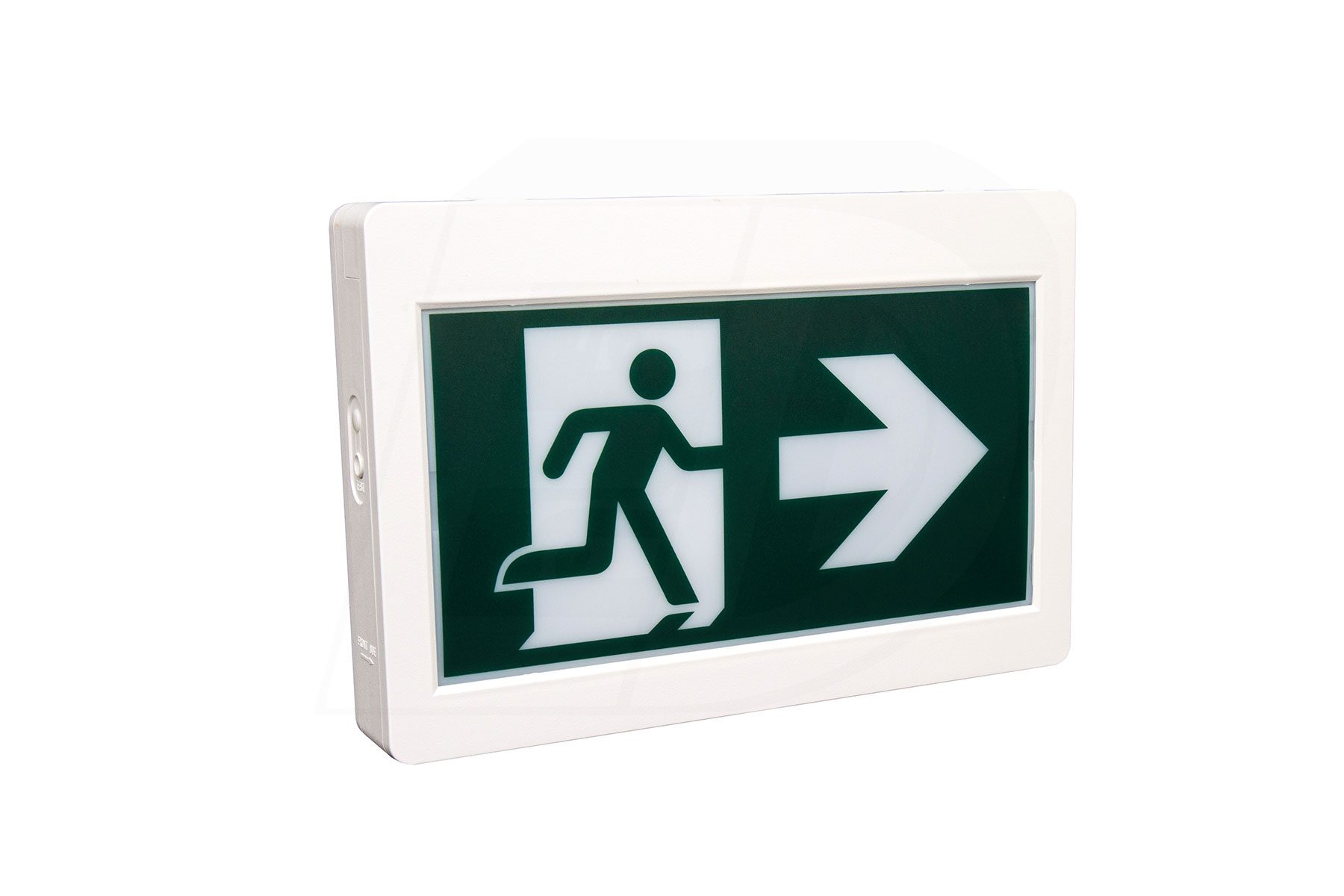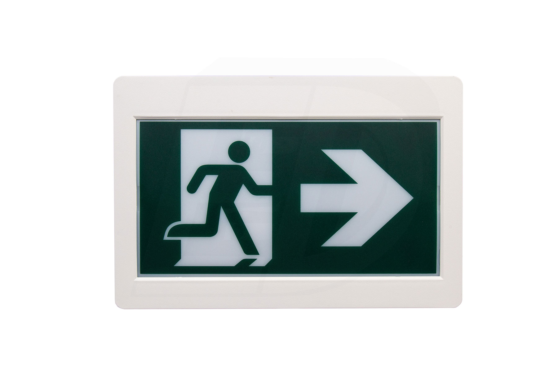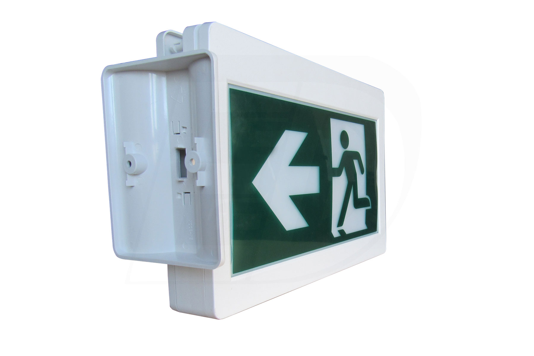 The sign and canopy snap together for easy ceiling or wall mount applications. 3 Running Man pictogram legends included and the housing provides for both single and double sided configurations. Wall mount via spider knockout configuration.