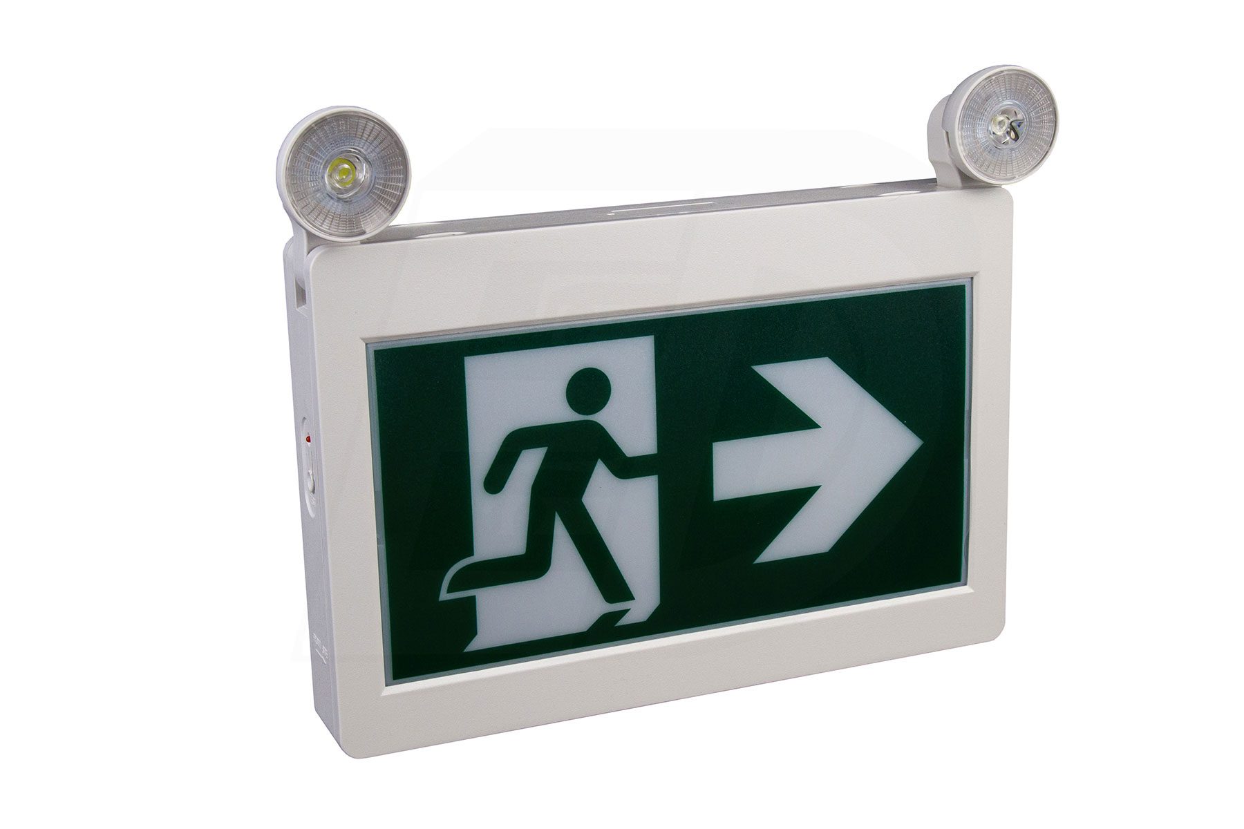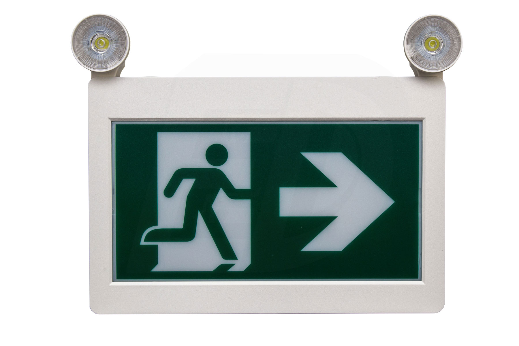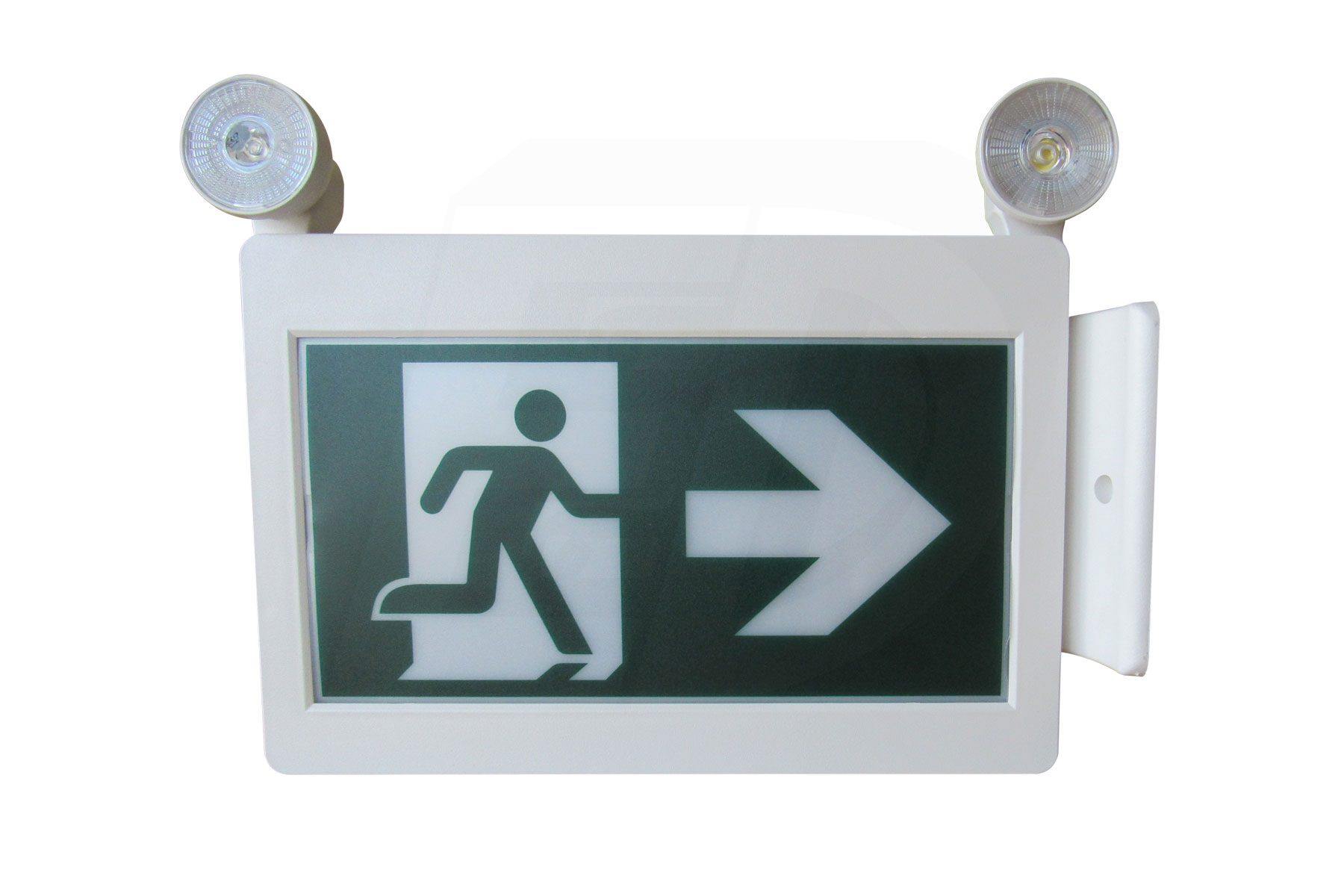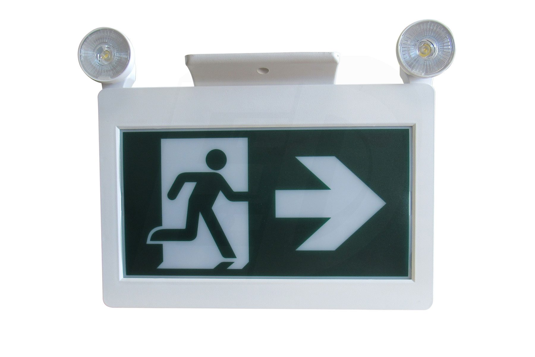 The sign and canopy snap together for easy ceiling or wall mount applications. Fully adjustable 2 x 2W LED lamp heads. Forward & Backward mounting. 3 Running Man pictogram legends included and the housing provides for both single and double sided configurations. Wall mount via spider knockout configuration.