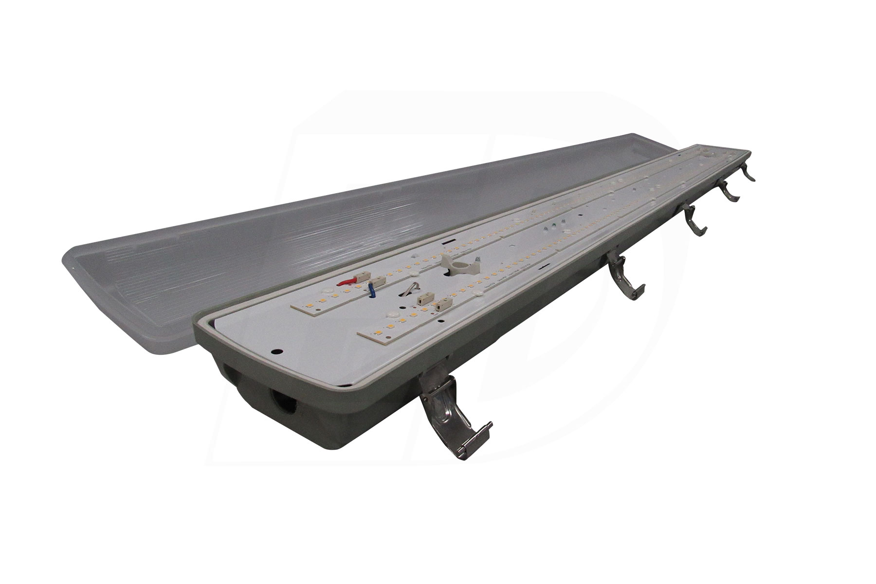 Manufactured with stainless steel mounting hardware as well as stainless steel clips, 100% UV stabilized polycarbonate housing and lens, these fixtures offer a durable, wet location option for any area where moisture may be a concern. Take advantage of further energy savings with 0-10V Continuous Dimming.